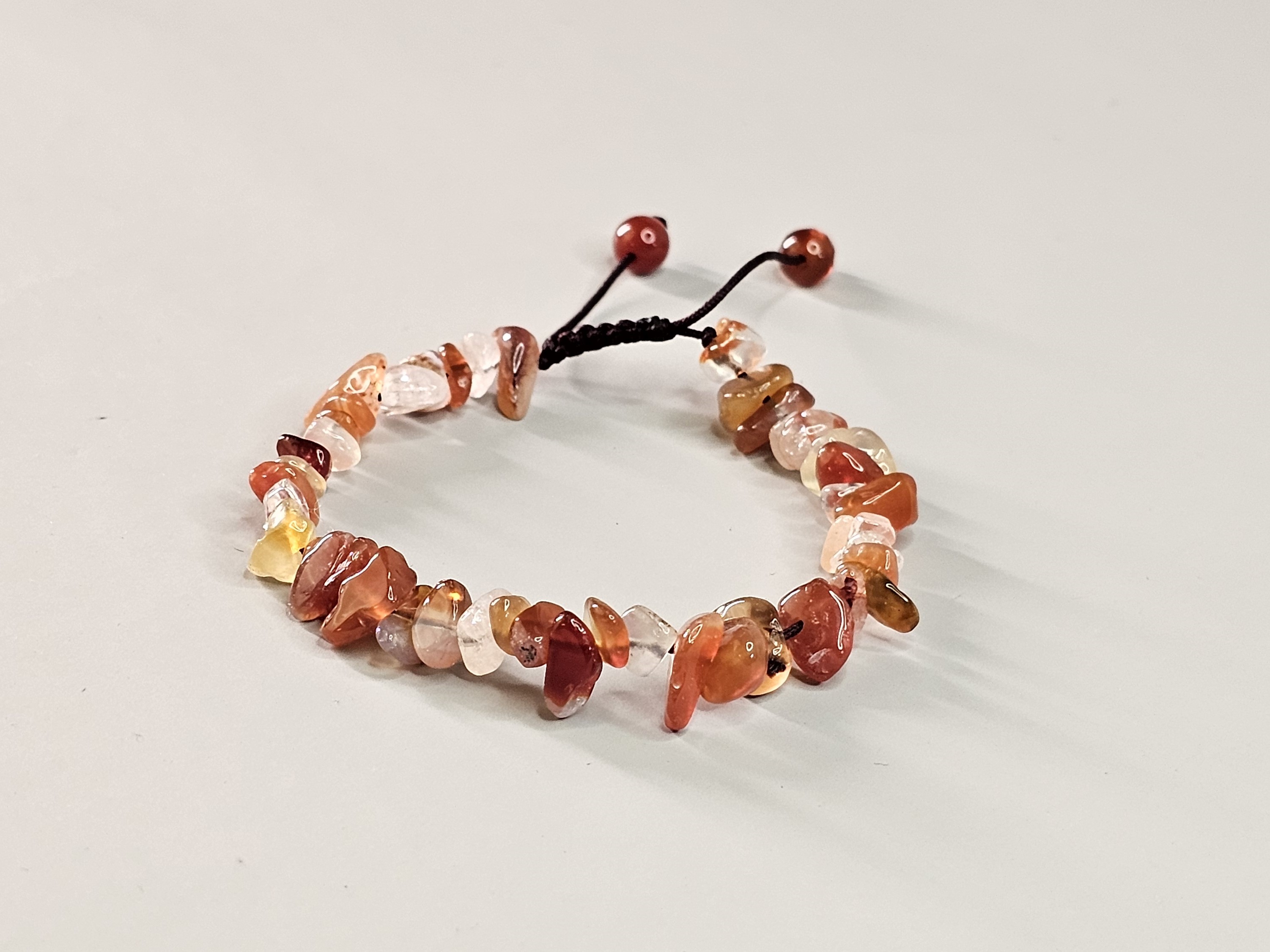 این دستبند از تکهسنگهای راف عقیق ساخته شده؛ سنگی که مثل شعلهای کوچک در مچ دست میدرخشد و انرژی زندگی، قدرت درونی و ثبات را به همراه دارد. رنگهای کهربایی، سرخ و عسلی عقیق، حس امنیت و گرمای روح را بیدار میکنند و پیوندی نرم میان قلب و زمین میسازند.