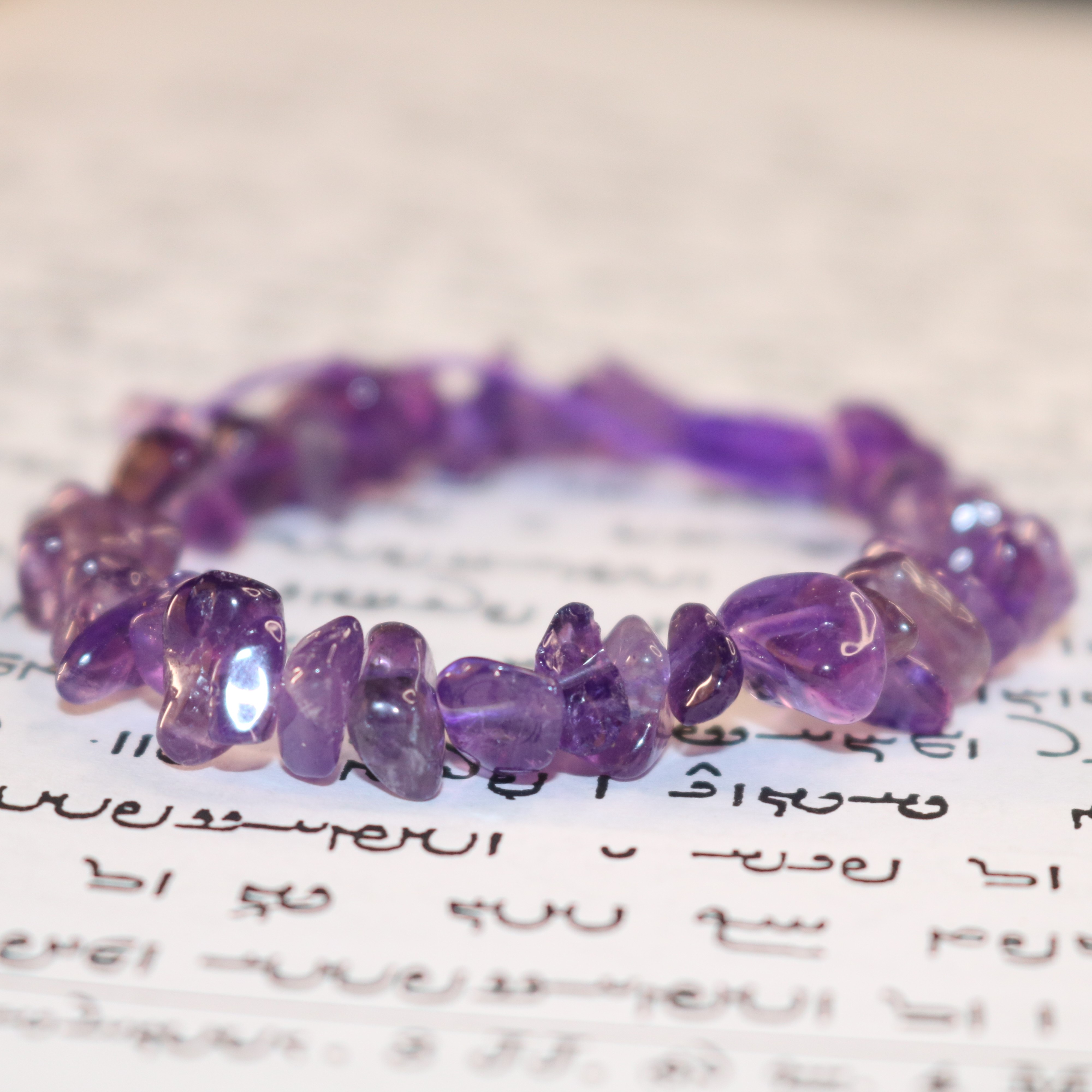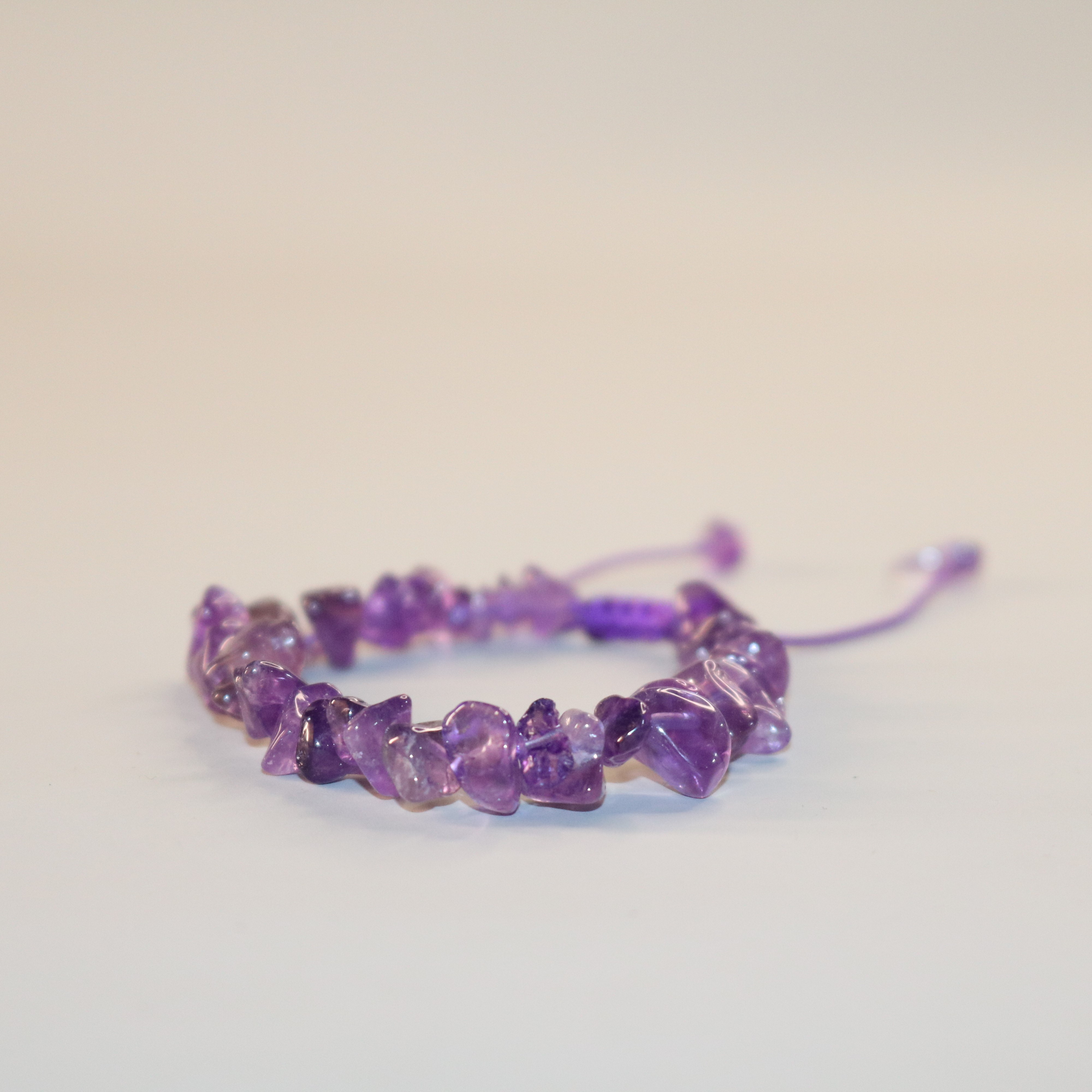 این دستبند با تکههای زیبای سنگ آمتیست طبیعی ساخته شده؛ سنگی که از گذشته نماد آرامش، شهود و پاکی ذهن بوده است.
