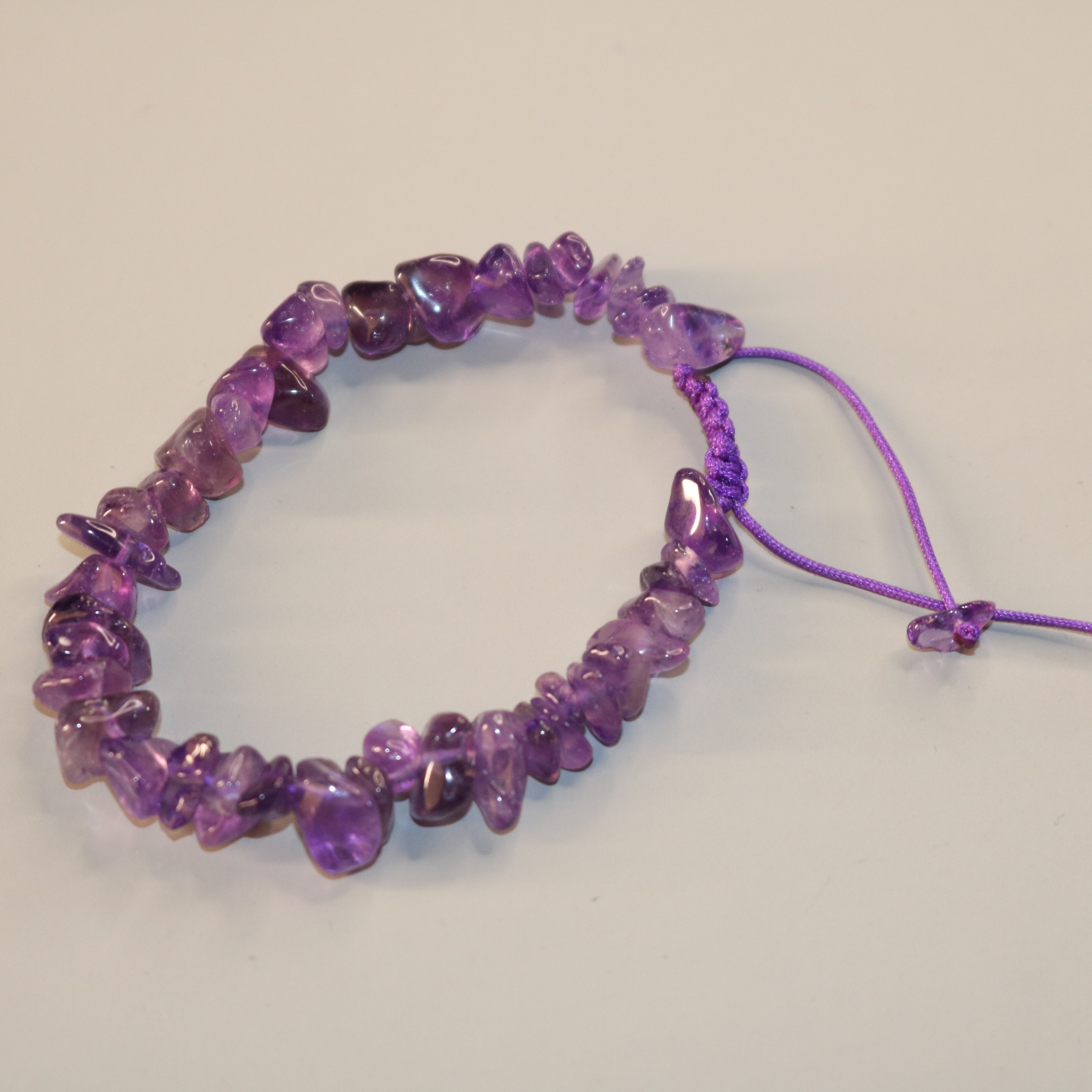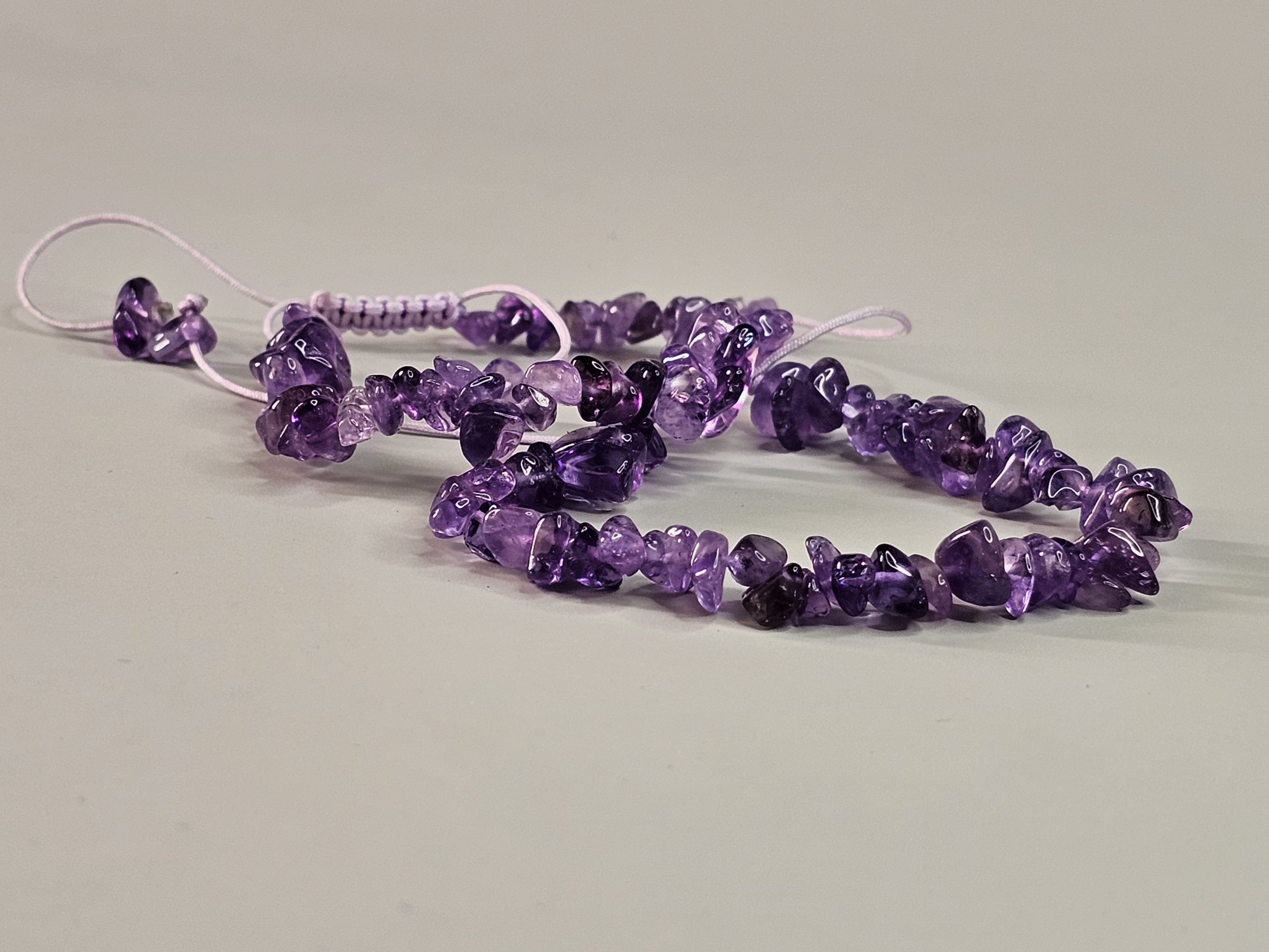 سنگ آرامش و شهود — ساختهشده با تکههای آمتیست و نخ مکرومهی بنفش، قابل تنظیم، مناسب برای مراقبه و استفاده روزانه.